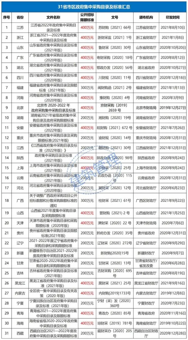 截至目前,已有25省市區(qū)發(fā)布2021年版或2022年版的政府采購集中采購目錄及標(biāo)準(zhǔn),其余6省執(zhí)行的是2020年版本文件。本文為除港澳臺(tái)外31個(gè)省最新采購政策大盤點(diǎn)!