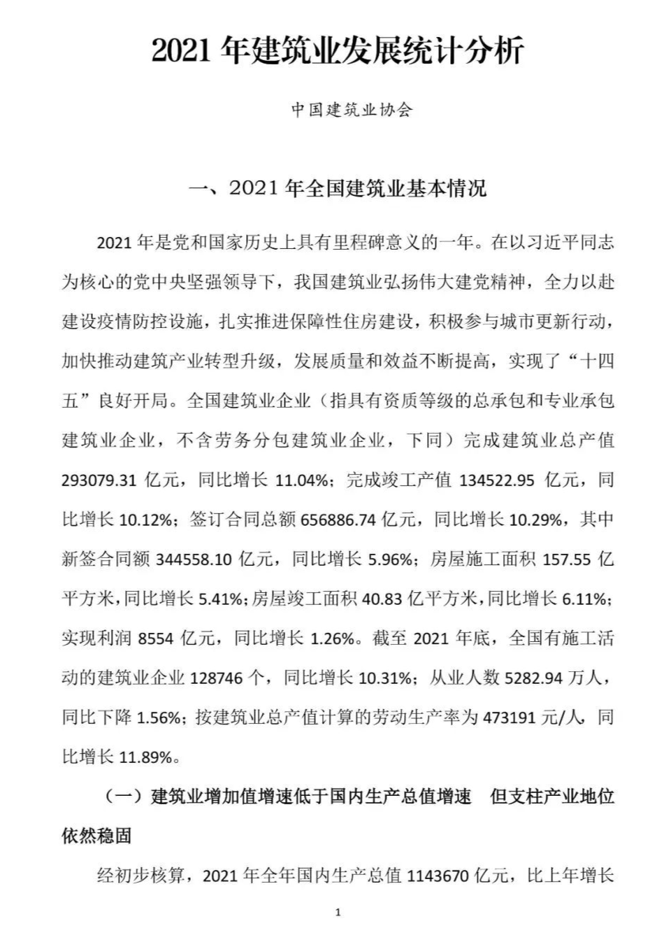 建筑業(yè)作為我國(guó)國(guó)民經(jīng)濟(jì)的支柱產(chǎn)業(yè),為推動(dòng)國(guó)民經(jīng)濟(jì)增長(zhǎng)和社會(huì)全面發(fā)展發(fā)揮了重要作用。隨著我國(guó)經(jīng)濟(jì)的快速發(fā)展以及人們對(duì)于房產(chǎn)建筑的剛性需求,我國(guó)建筑行業(yè)總產(chǎn)值逐年上升。下面,我們就一起來(lái)了解下2021年中國(guó)建筑行業(yè)發(fā)展統(tǒng)計(jì)分析報(bào)告。