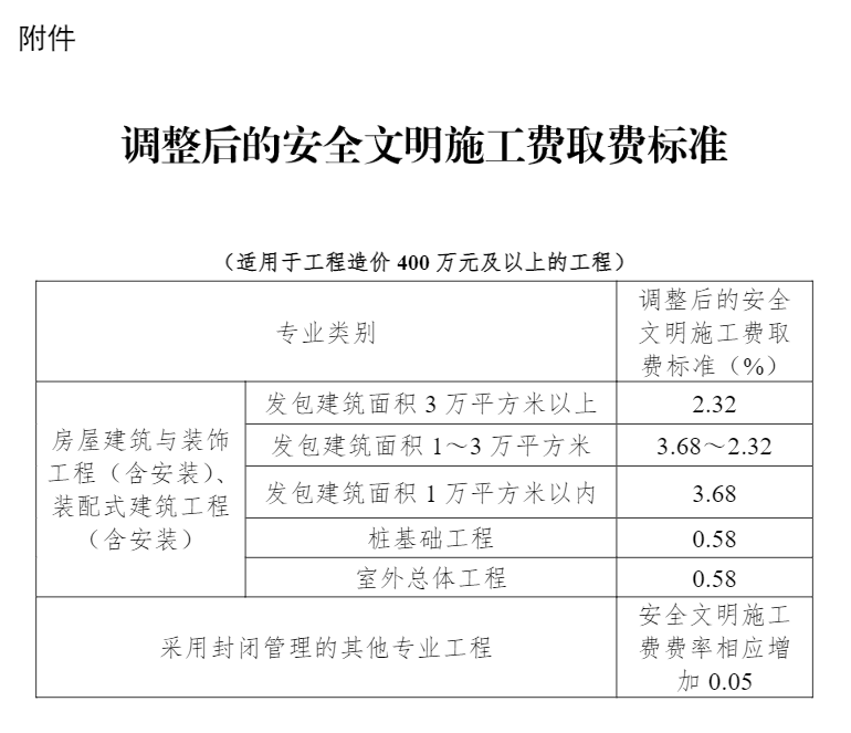 (一)工程造價400萬元及以上的房屋建筑與裝飾工程(含安裝)、裝配式建筑工程(含安裝)以及采用封閉管理的其他工程,其安全文明施工費(fèi)費(fèi)率相應(yīng)增加0.05-0.1%。調(diào)整后的安全文明施工費(fèi)取費(fèi)標(biāo)準(zhǔn)詳見附件。新政 | 住建廳:發(fā)布計價依據(jù),400萬元及以上工程按本通知實施!