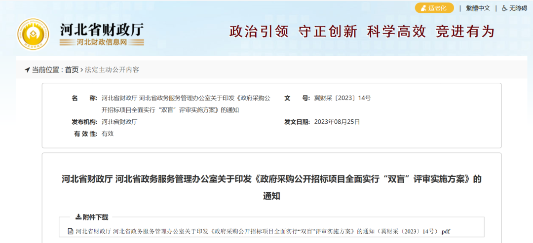 河北省政務(wù)服務(wù)管理辦公室發(fā)布關(guān)于印發(fā)《政府采購公開招標(biāo)項目全面實行“雙盲”評審實施方案》的通知!