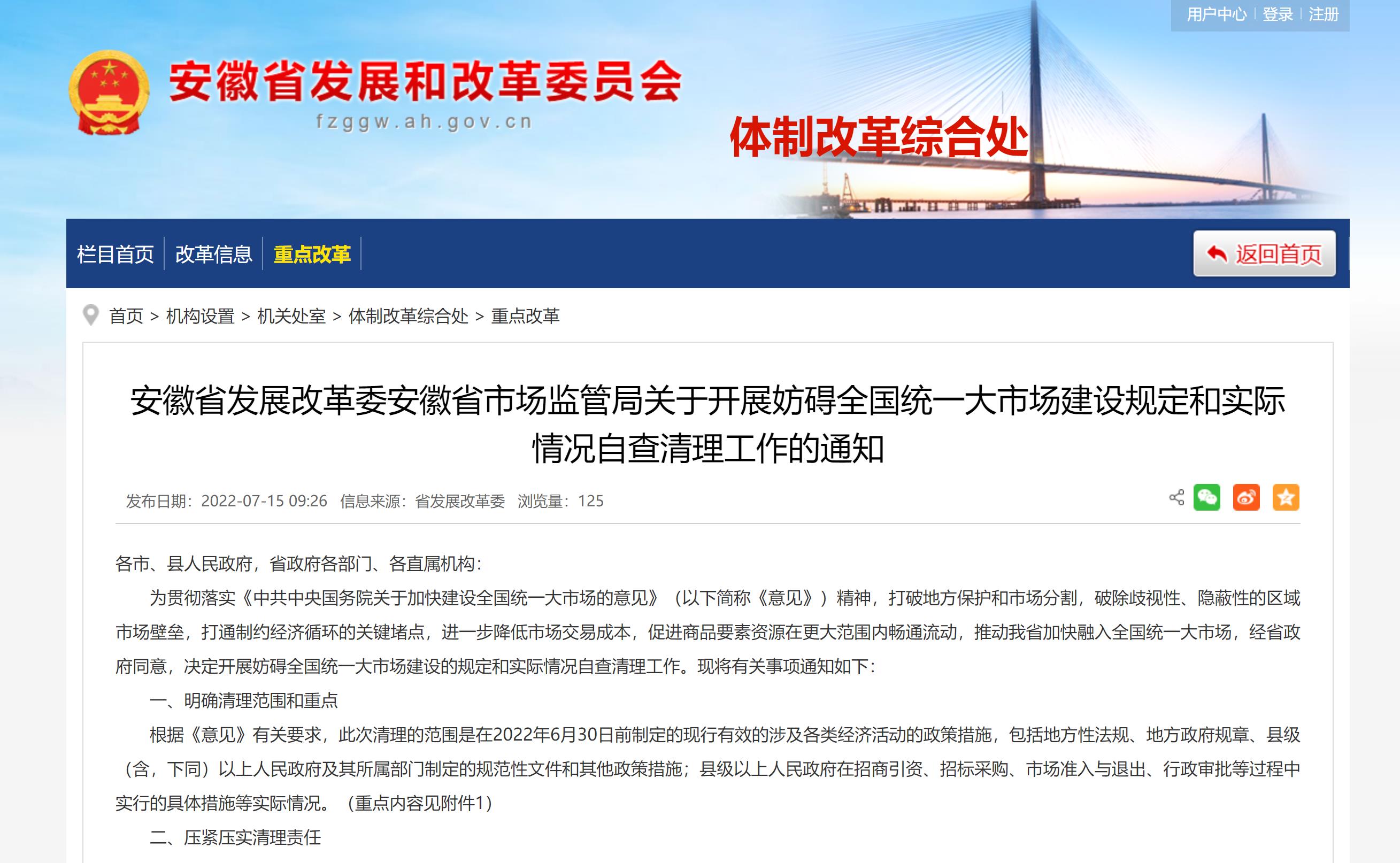 近日,安徽省發(fā)展和改革委、省市場(chǎng)監(jiān)管局聯(lián)合發(fā)布《關(guān)于開(kāi)展妨礙全國(guó)統(tǒng)一大市場(chǎng)建設(shè)規(guī)定和實(shí)際情況自查清理工作的通知》(以下簡(jiǎn)稱《通知》),其中明確清理的具體范圍和重點(diǎn)。...