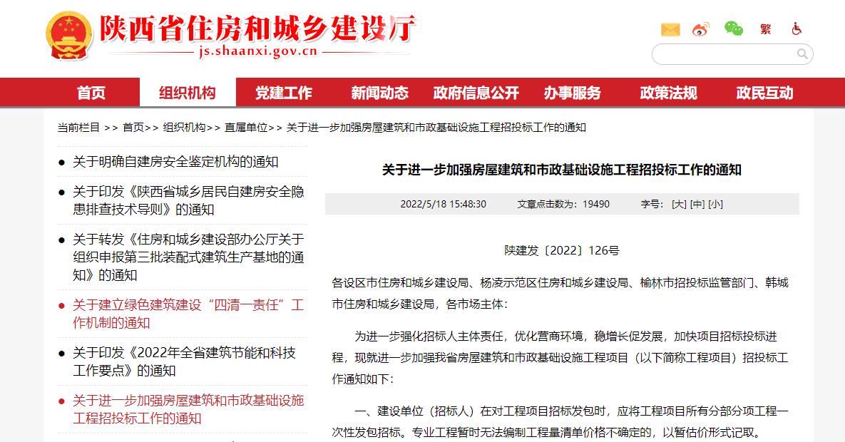 近日,陜西省住房和城鄉(xiāng)建設(shè)廳發(fā)布《關(guān)于進一步加強房屋建筑和市政基礎(chǔ)設(shè)施工程招投標工作的通知》(以下簡稱《通知》),要求建設(shè)單位(招標人)在對工程項目招標發(fā)包時,應(yīng)將工程項目所有分部分項工程一次性發(fā)包招標。專業(yè)工...