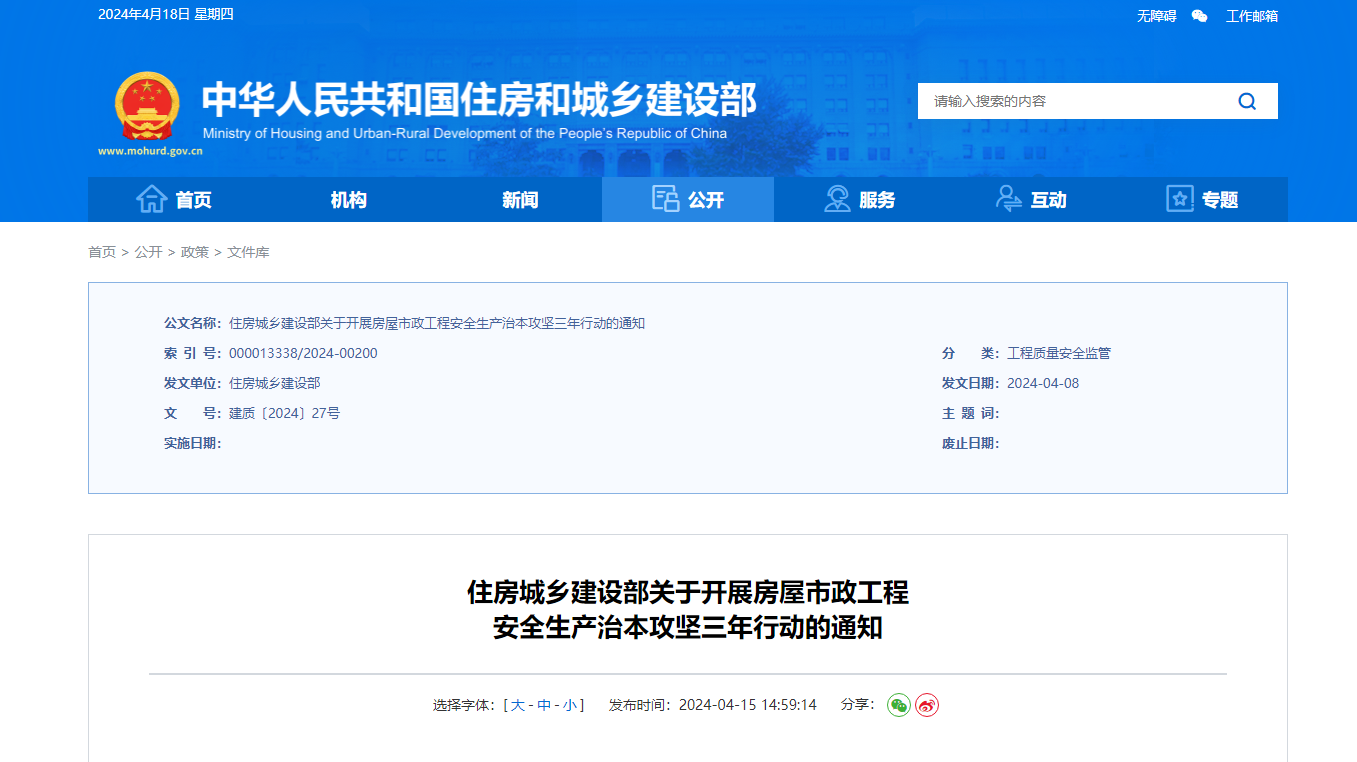 近日,住建部發(fā)布《關(guān)于開展房屋市政工程安全生產(chǎn)治本攻堅(jiān)三年行動(dòng)的通知》。提出: “逐企業(yè)、逐項(xiàng)目、逐設(shè)備”檢查在建房屋市政工程!“逐企...