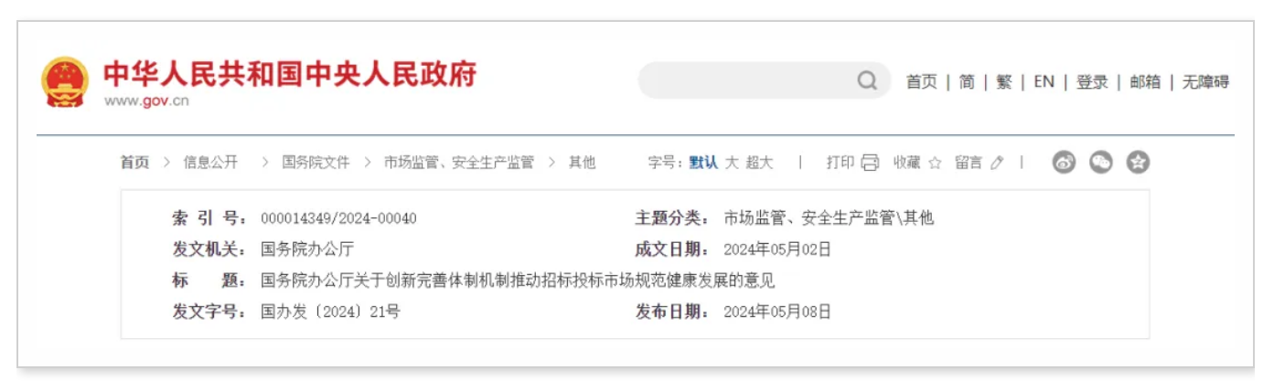 國(guó)務(wù)院辦公廳關(guān)于創(chuàng)新完善體制機(jī)制推動(dòng)招標(biāo)投標(biāo)市場(chǎng)規(guī)范健康發(fā)展的意見 國(guó)辦發(fā)〔2024〕21號(hào) 各省、自治區(qū)、直轄市人民政府,國(guó)務(wù)院各部委、各直屬機(jī)構(gòu): 招標(biāo)投標(biāo)...