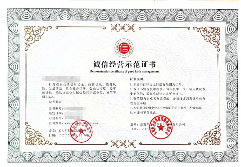 2、誠(chéng)信經(jīng)營(yíng)示范證書。
