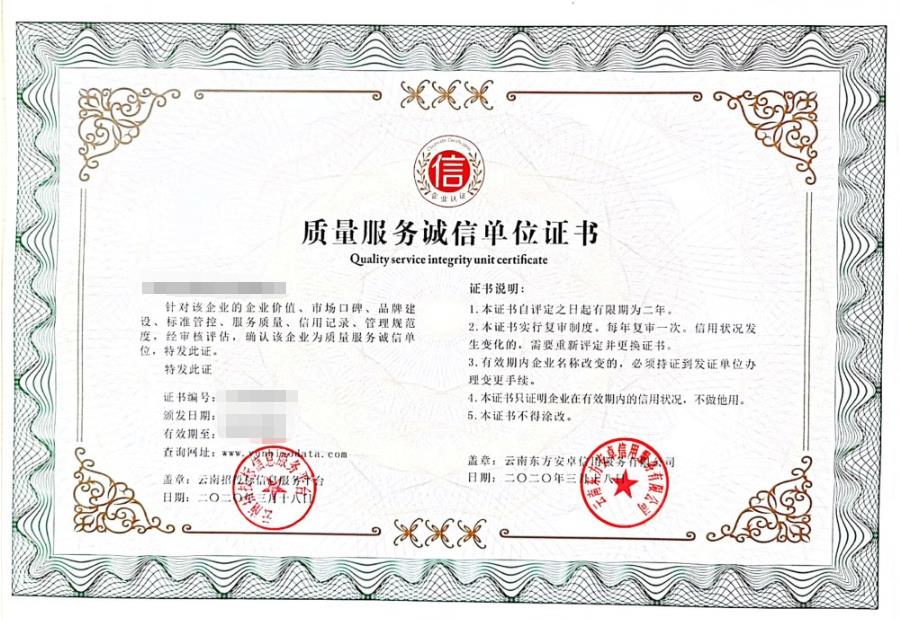 4、質(zhì)量服務(wù)誠(chéng)信單位證書。