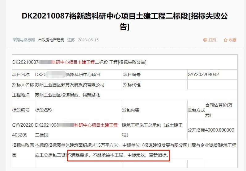 招標(biāo)失敗原因顯示“本標(biāo)段招標(biāo)圖單體建筑面積超過15萬平方米,中標(biāo)單位現(xiàn)有企業(yè)資質(zhì)[建筑工程施工總承包二級]不滿足要求,不能承接本工程,中標(biāo)無效,重新招標(biāo)。”